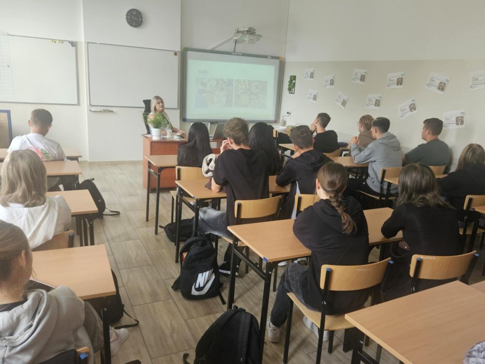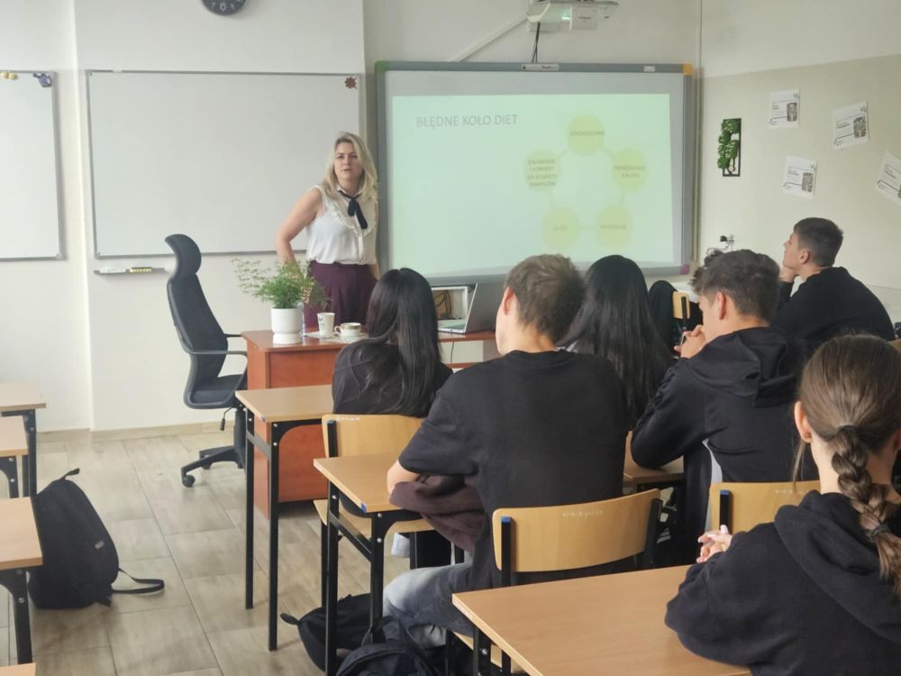 Uczniowie klas 1TEA i 1TGR wzięli udział w spotkaniu z dietetykiem, Panią Karolina Mendak z Poradnii Dietetycznej Karotka, którego tematem było zdrowe odżywianie i styl życia. Podczas zajęć młodzież dowiedziała się, co warto jeść na co dzień, jak planować posiłki oraz na co zwracać uwagę przy wyborze produktów w sklepie. Poruszono także temat popularnych błędów żywieniowych i wpływu diety na koncentrację, energię i samopoczucie. Dietetyk przypomniała, że zdrowy styl życia to nie tylko jedzenie – to także aktywność fizyczna, odpowiedni sen i unikanie nadmiaru przetworzonej żywności. Takie spotkania pomagają zrozumieć, że dobre nawyki warto budować już teraz, by cieszyć się zdrowiem w przyszłości. Dziękujemy za ciekawą i praktyczną lekcję!