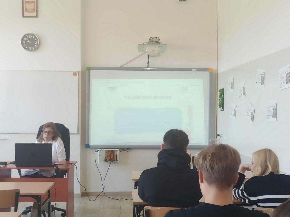 Uczniowie pozyskali wiedzę z zakresu historii ubezpieczeń, ubezpieczeń społecznych, ubezpieczenia zdrowotnego osób zatrudnionych na podstawie umów o pracę, umów cywilnych oraz w zakresie samozatrudnienia. Podejmowana tematyka dotyczyła również zagadnień związanych z eZUS i PUE- ZUS. Zajęcia wzbogacono ciekawymi filmami i prezentacją multimedialną. Spotkanie ugruntowało i wzbogaciło wiedzę uczniów oraz stanowiło interesujące doświadczenie edukacyjne.