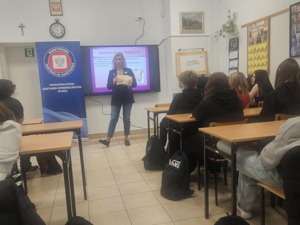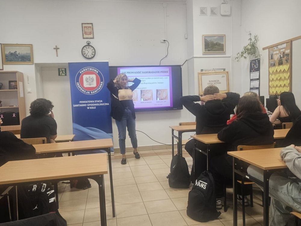 Z radością informujemy, że nasza szkoła przyłączyła się do wojewódzkiego projektu edukacyjnego „Co kryją Twoje piersi?”, organizowanego przez Wojewódzką Stację Sanitarno‑Epidemiologiczną w Wielkopolsce. Celem tej inicjatywy jest podniesienie świadomości na temat raka piersi, jego czynników ryzyka oraz znaczenia badań i samobadania. Uczniowie obejrzeli prezentację, w której omówiono m.in. jakie są czynniki ryzyka raka piersi, jakie są możliwości profilaktyki oraz jakie objawy mogą być sygnałem alarmowym. Odbyły się praktyczne warsztaty z użyciem fantomu piersi — młodzież miała okazję poznać i przećwiczyć samobadanie piersi pod okiem prowadzącej. Wszyscy uczestnicy otrzymali ulotki edukacyjne zawierające instrukcje samobadania, wskazówki profilaktyczne oraz informacje, gdzie i jak można skorzystać z badań przesiewowych .Dziękujemy wszystkim uczniom i uczennicom, którzy wzięli udział w zajęciach, a także Pani Krystynie Wojdak za profesjonalne i angażujące warsztaty. Razem możemy zadbać o zdrowie i stworzyć kulturę świadomości, która zaprocentuje nie tylko dziś, ale w przyszłości.