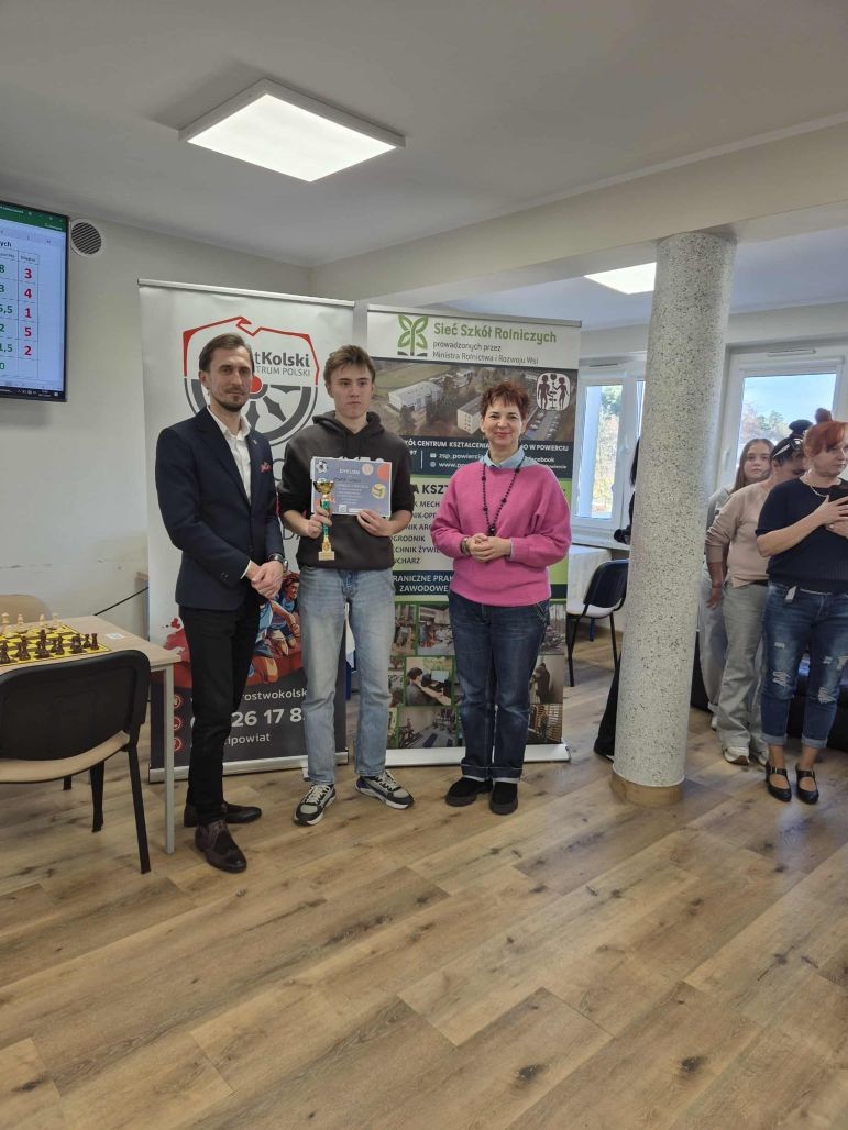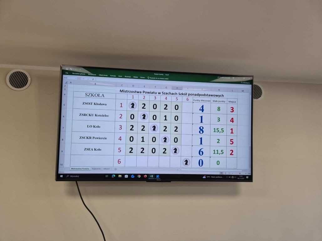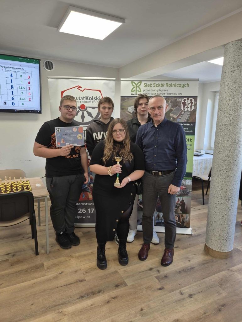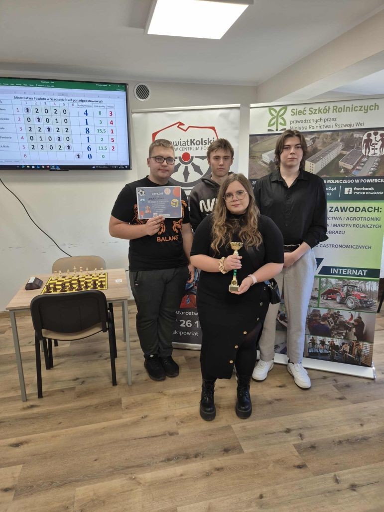 6. listopada odbyły się w Powierciu Mistrzostwa Powiatu w Szachach Drużynowych. Do rywalizacji przystąpili reprezentanci pięciu szkół. Nasza drużyna pokonała ZST Kłodawa 3,5-0,5, ZSCKR Powiercie 4-0, ZSRCKU Kościelec 4-0 i przegrała z LO 0-4. Ostatecznie zajęliśmy 2. miejsce w powiecie kolskim i tym samym awansowaliśmy do finału wojewódzkiego.