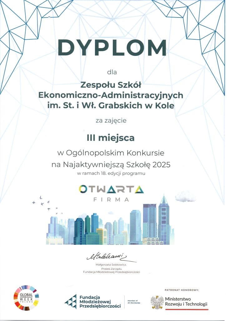 Zespół Szkół Ekonomiczno - Administracyjnych w Kole po raz dziewiąty zdobywa tytuł Najaktywniejszej Szkoły w Polsce w ogólnopolskim programie „Otwarta firma 2025” realizowanym w ramach Światowego Tygodnia Przedsiębiorczości. W tym roku kapituła konkursu nagradzała tylko cztery najaktywniejsze szkoły ponadpodstawowe i cztery najaktywniejsze szkoły podstawowe.