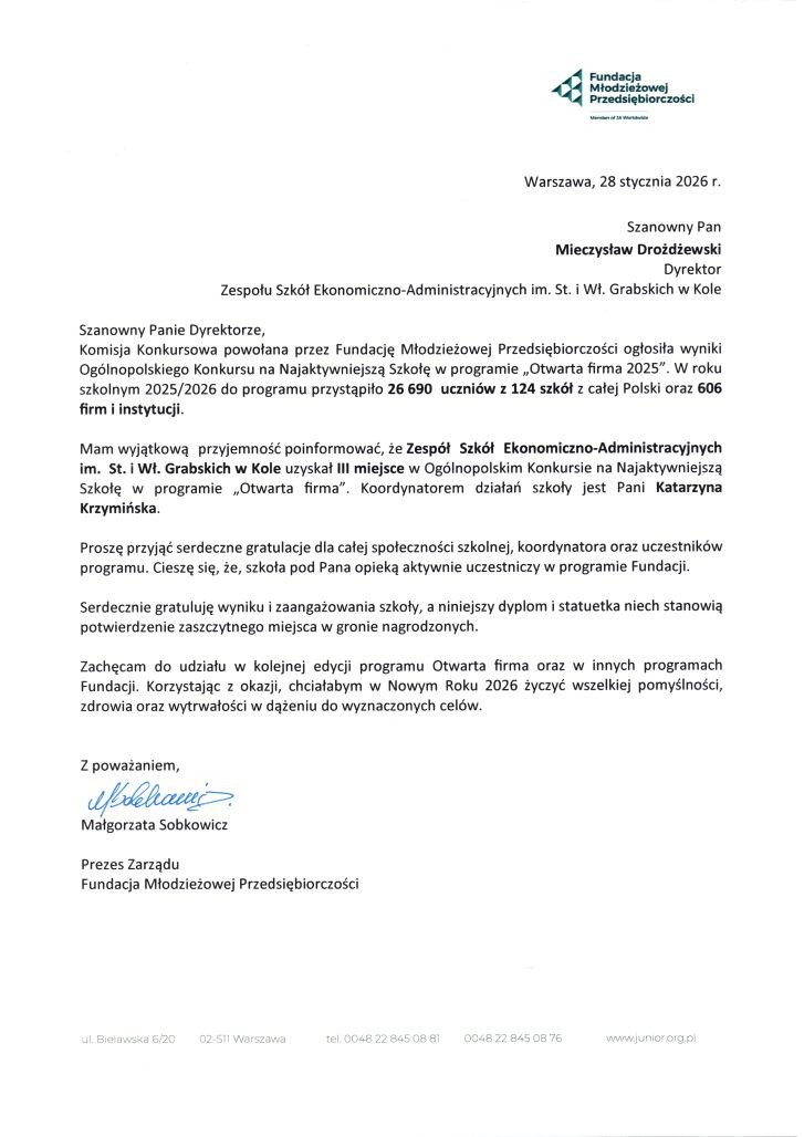 W dniach 17 – 23 listopada 2025 roku odbyła się 18. edycja programu „Otwarta firma” w ramach Światowego Tygodnia Przedsiębiorczości. Zespół Szkół Ekonomiczno-Administracyjnych w Kole po raz dziesiąty przystąpił do tego programu. Dzięki zaproszonym gościom, wytężonej pracy wielu nauczycieli i szkolnego koordynatora programu pani Katarzyny Krzymińskiej, kolski Ekonomik po raz dziewiąty znalazł się wśród najbardziej aktywnych szkół w Polsce, zajmując tym razem miejsce na podium.