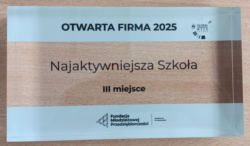 Zespół Szkół Ekonomiczno-Administracyjnych w Kole otrzymał tytuł „Najaktywniejszej Szkoły” w konkursie towarzyszącym programowi „Otwarta firma 2025”, zajmując III miejsce. To duży sukces uczniów i nauczycieli, możliwy do osiągnięcia dzięki zaangażowaniu lokalnych przedsiębiorców, którzy zechcieli poświęcić swój cenny czas na spotkania z młodzieżą.