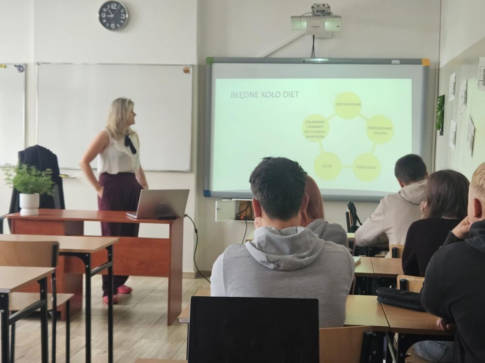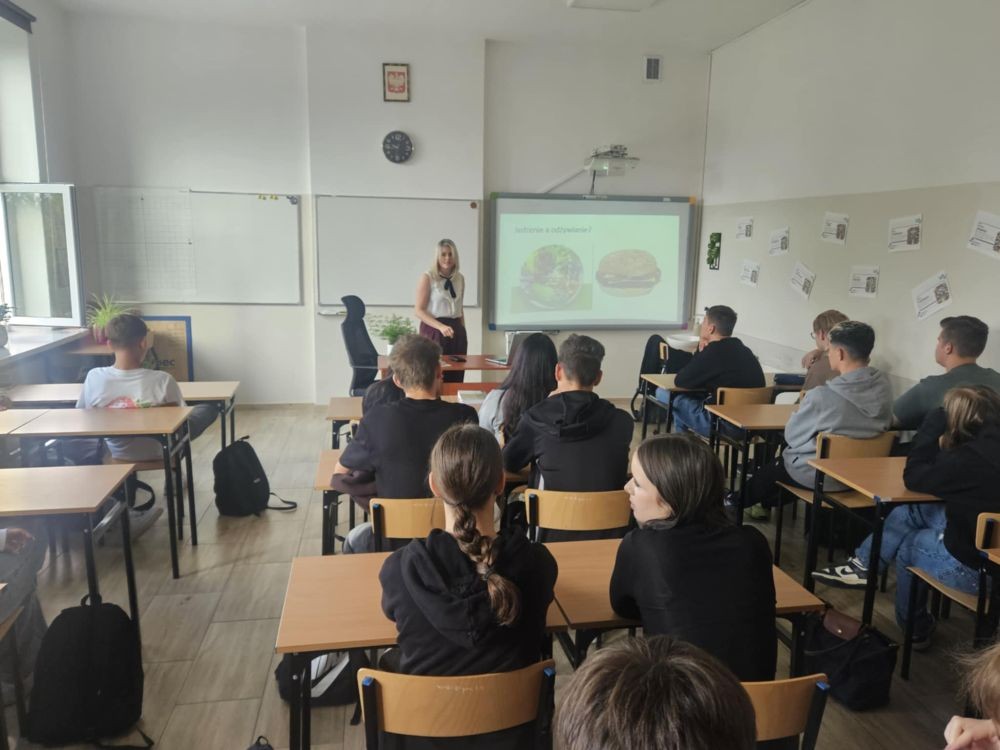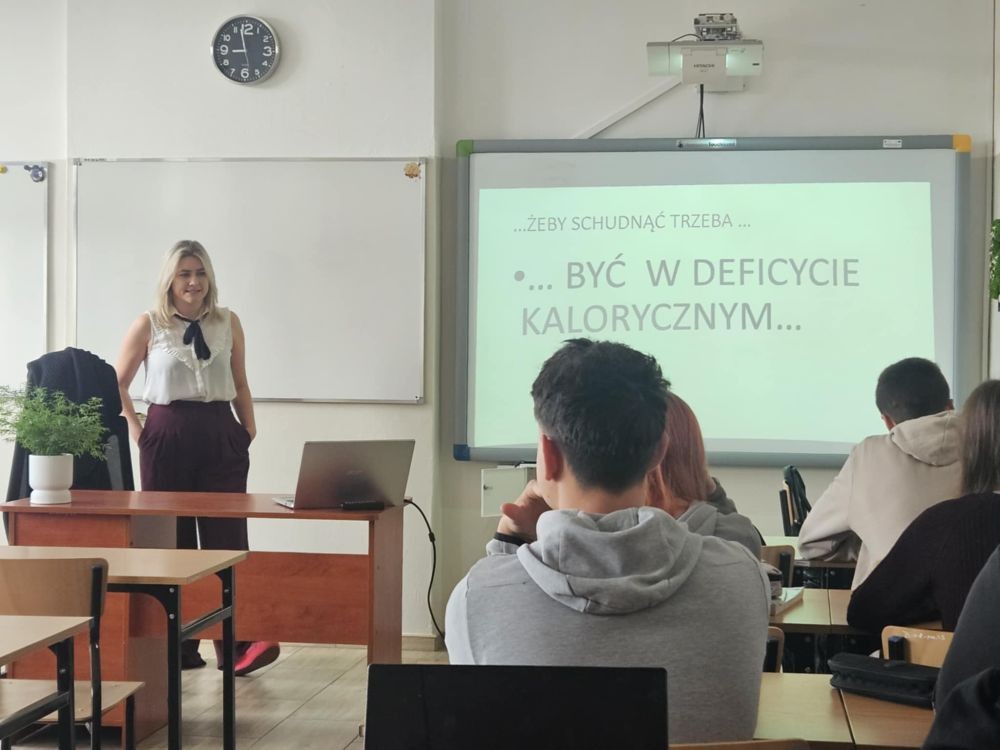 Uczniowie klas 1TEA i 1TGR wzięli udział w spotkaniu z dietetykiem, Panią Karolina Mendak z Poradnii Dietetycznej Karotka, którego tematem było zdrowe odżywianie i styl życia. Podczas zajęć młodzież dowiedziała się, co warto jeść na co dzień, jak planować posiłki oraz na co zwracać uwagę przy wyborze produktów w sklepie. Poruszono także temat popularnych błędów żywieniowych i wpływu diety na koncentrację, energię i samopoczucie. Dietetyk przypomniała, że zdrowy styl życia to nie tylko jedzenie – to także aktywność fizyczna, odpowiedni sen i unikanie nadmiaru przetworzonej żywności. Takie spotkania pomagają zrozumieć, że dobre nawyki warto budować już teraz, by cieszyć się zdrowiem w przyszłości. Dziękujemy za ciekawą i praktyczną lekcję!