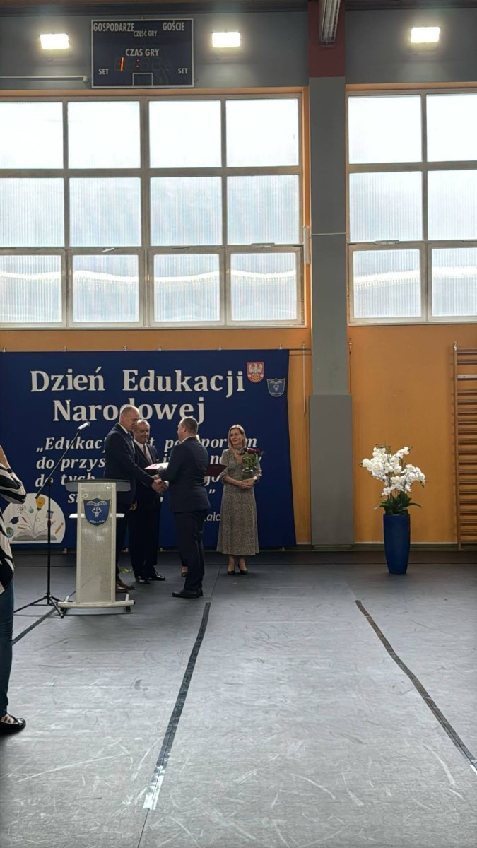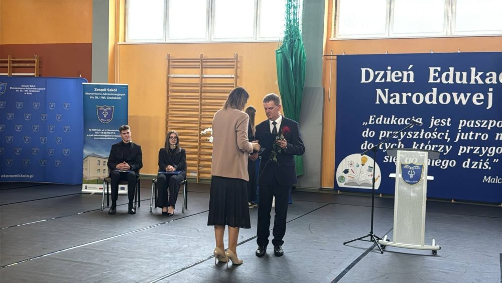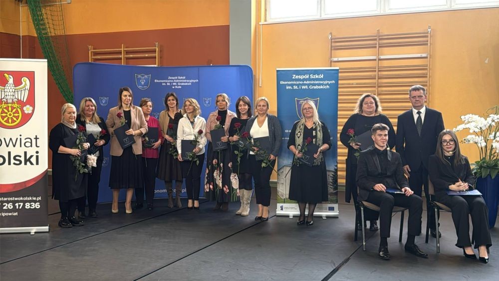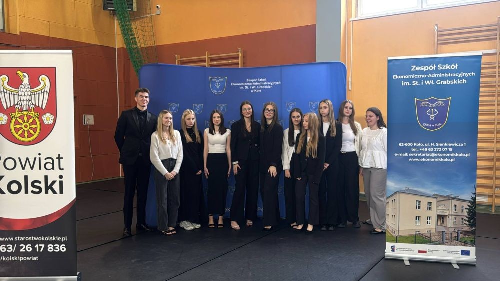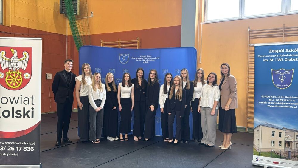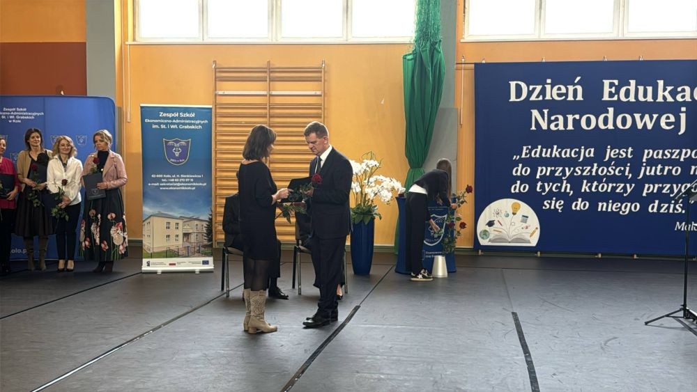 15 października Zespół Szkół Ekonomiczno-Administracyjnych im. St. i Wł. Grabskich był organizatorem powiatowych obchodów Dnia Edukacji Narodowej. W wyjątkowy nastrój tej uroczystości wprowadzili Nas Karolina, Milena, Ola oraz Wiktor, prezentując przepiękny układ taneczny. Prowadzący, Kira Kavaliunaitse oraz Jakub Niszczak, powitali wszystkich obecnych. Wprowadzony został sztandar szkoły i odśpiewano hymn. Następnie Pan Dyrektor Mieczysław Drożdżewski przywitał przybyłych na uroczystość gości i poprosił o zabranie głosu Starostę Kolskiego Pana Roberta Kropidłowskiego. W jego imieniu życzenia z okazji Dnia Edukacji Narodowej złożył Wicestarosta Lech Brzeziński. Po jego wystąpieniu Starosta, wspólnie z Przewodniczącym Rady Powiatu Kolskiego Panem Ryszardem Kasiorkiem, Naczelnikiem Wydziału Oświaty, Kultury i Promocji Panią Dorotą Szkudlarek oraz Zastępcą Naczelnika Panią Alicją Łączkowską, wręczyli nagrody dyrektorom oraz nauczycielom ze szkół ponadpodstawowych powiatu kolskiego, doceniając ich szczególne osiągnięcia. Głos zabrała również przedstawicielka Związku Nauczycielstwa Polskiego Pani Joanna Adamczyk. Muzycznie uświetniła ten moment Antonina Jabłońska przy akompaniamencie Klaudii Gajdy oraz Oliwii Biernat, wykonując utwór autorstwa Henryka Perzyńskiego pod tytułem „Czyjeś serce”. Następnie nauczyciele kolskiego „Ekonomika” zostali uhonorowani nagrodami Dyrektora ZSEA. Prowadzący uroczystość złożyli wszystkim życzenia, a przedstawicielki Samorządu Uczniowskiego wręczyły upominki z okazji Dnia Edukacji Narodowej. W tle mogliśmy wysłuchać pięknej recytacji „Lekcji” w wykonaniu Marceliny Kosteckiej oraz niezapomnianej interpretacji piosenki „Riptide” w wykonaniu Marii Kacperskiej. Podczas uroczystego apelu nagrody w postaci dyplomu oraz bonu na wspólne wyjście otrzymały klasy, które osiągnęły najwyższą średnią oraz zapracowały na najlepszą frekwencję w ubiegłym roku szkolnym. Zwycięzcami w przypadku osiąganych wyników są uczniowie obecnej klasy 4 TEA, natomiast klasa 3 TR wiedzie prym w regularnym uczęszczaniu na zajęcia. Artystycznie moment ten wzbogaciły występy Wiktora Bucikiewicza, wykonującego solowy układ choreograficzny oraz Leny Niszczak, śpiewającej utwór Oskara Cymsa „Nie musisz się bać”. Zwieńczeniem występów muzycznych było wspólne wykonanie utworu „Sobie i Wam” z repertuaru Męskie Granie Orkiestra. Przy mikrofonie stanęły Antosia Jabłońska, Oliwia Biernat, Julia Podolska, Marcelina Kostecka, Nikola Łagosz, Julia Królikowska, Julia Krawczyk, Magdalena Pankowska, Weronika Jakubowska oraz Pani Anna Malicka.