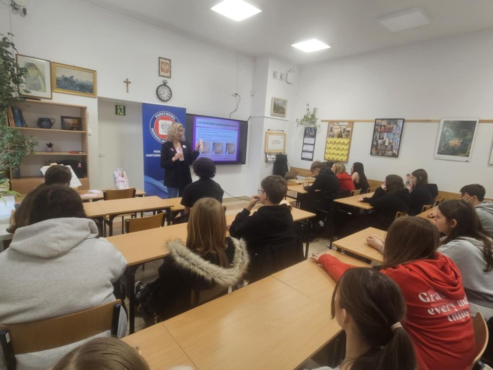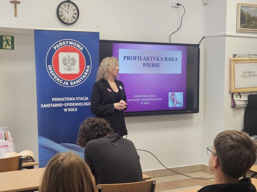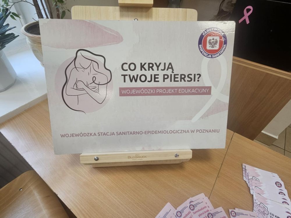 Z radością informujemy, że nasza szkoła przyłączyła się do wojewódzkiego projektu edukacyjnego „Co kryją Twoje piersi?”, organizowanego przez Wojewódzką Stację Sanitarno‑Epidemiologiczną w Wielkopolsce. Celem tej inicjatywy jest podniesienie świadomości na temat raka piersi, jego czynników ryzyka oraz znaczenia badań i samobadania. Uczniowie obejrzeli prezentację, w której omówiono m.in. jakie są czynniki ryzyka raka piersi, jakie są możliwości profilaktyki oraz jakie objawy mogą być sygnałem alarmowym. Odbyły się praktyczne warsztaty z użyciem fantomu piersi — młodzież miała okazję poznać i przećwiczyć samobadanie piersi pod okiem prowadzącej. Wszyscy uczestnicy otrzymali ulotki edukacyjne zawierające instrukcje samobadania, wskazówki profilaktyczne oraz informacje, gdzie i jak można skorzystać z badań przesiewowych .Dziękujemy wszystkim uczniom i uczennicom, którzy wzięli udział w zajęciach, a także Pani Krystynie Wojdak za profesjonalne i angażujące warsztaty. Razem możemy zadbać o zdrowie i stworzyć kulturę świadomości, która zaprocentuje nie tylko dziś, ale w przyszłości.