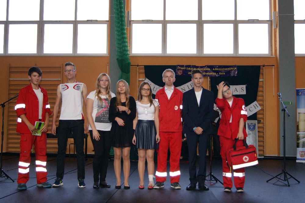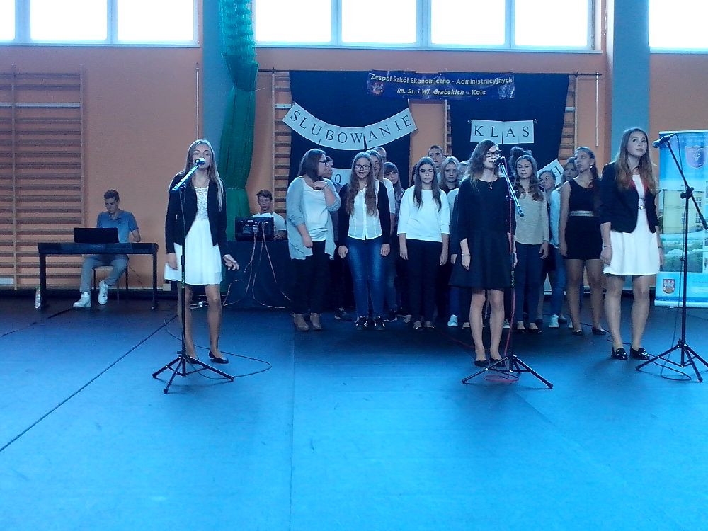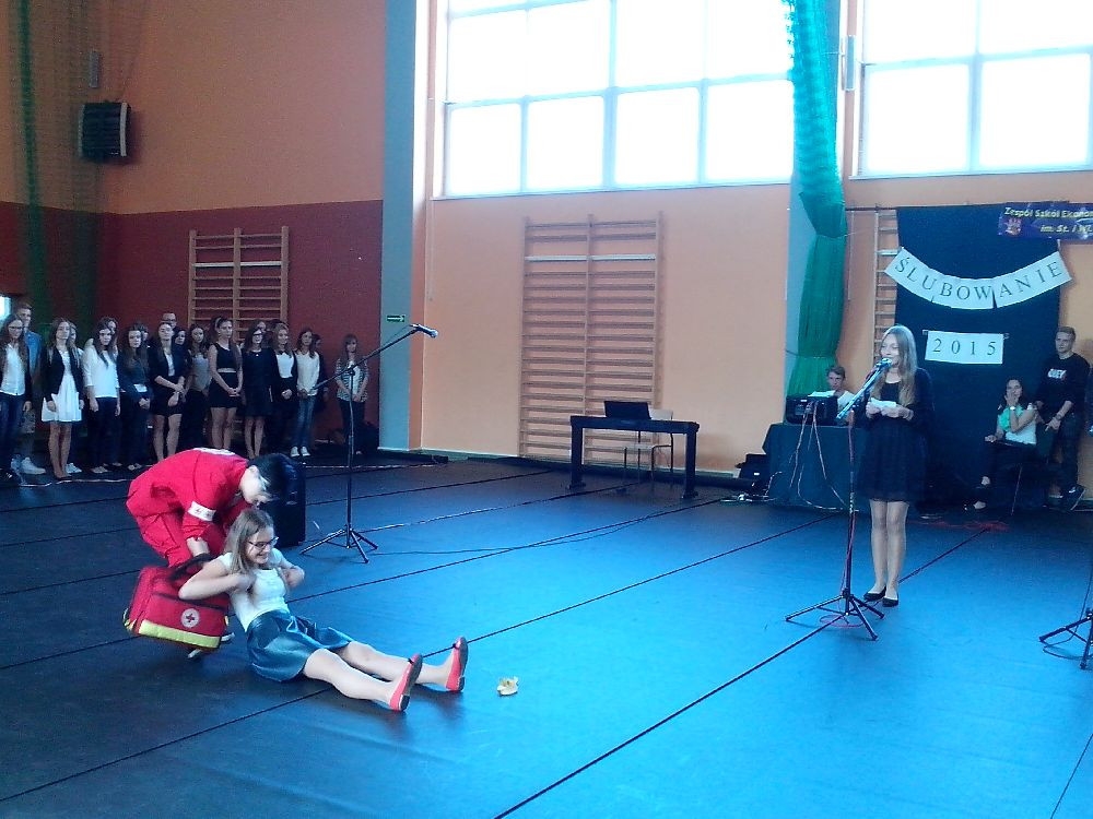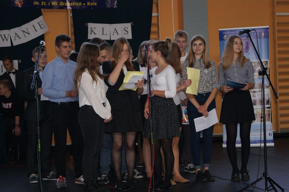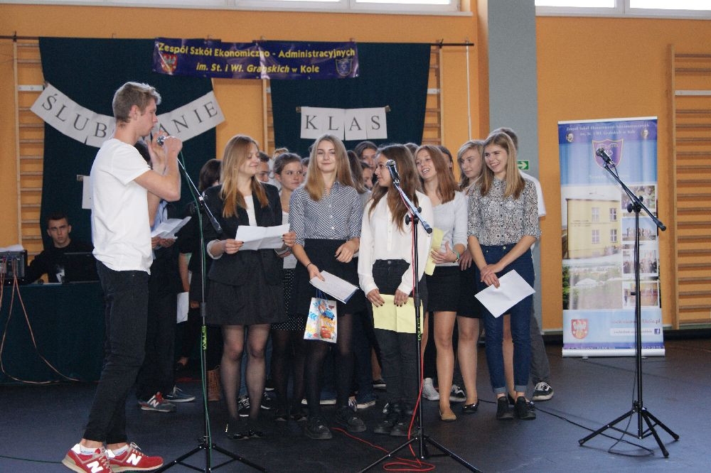 Uroczystość powitania nowo przybyłych była podzielona na dwie części. W trakcie pierwszej części Julia Kos i Maciej Karmelita w kilku słowach przedstawili historię szkoły natomiast pani dyrektor Elżbieta Sztanga przyjęła ślubowanie złożone przez pierwszoklasistów w obecności sztandaru szkoły. Ponadto Rada Rodziców ufundowała dla naszych młodszych koleżanek i kolegów upominki w postaci silikonowych etui na telefon. Druga część miała nieco luźniejszy charakter. Uczniowie klas pierwszych prezentowali swoje umiejętności przed starszymi kolegami. Dzięki ich kreatywności publiczność mogła podziwiać pozoracje, skecz oraz zasłuchać się w piosenkach.