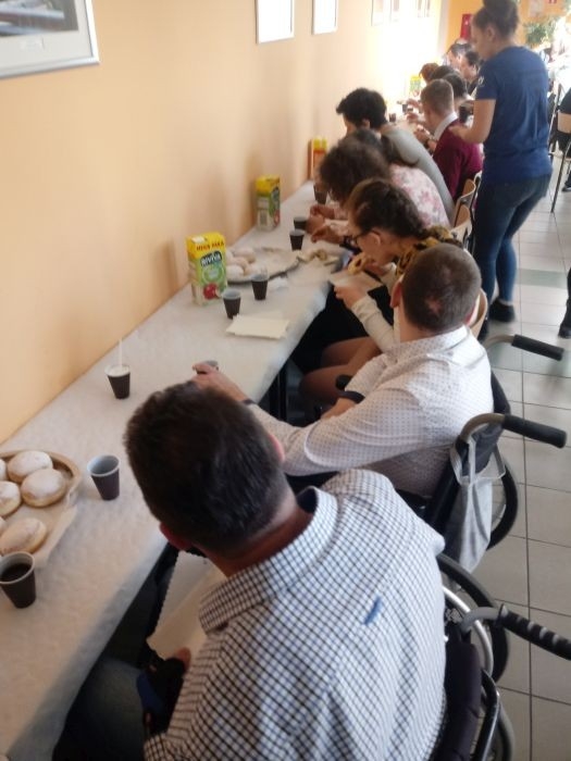 Podczas zajęć odbyły się konkurencje sportowe tj.: gra w kręgle, rzuty piłką do kosza, kozłowanie piłki z przeszkodami i wiele innych zabawnych rozgrywek. Obok słodkiego poczęstunku, zgodnie z tradycją, nie mogło zabraknąć pączków. Czas spotkania umilała muzyka, goście wspólnie z wolontariuszami chętnie włączyli się do tańca.